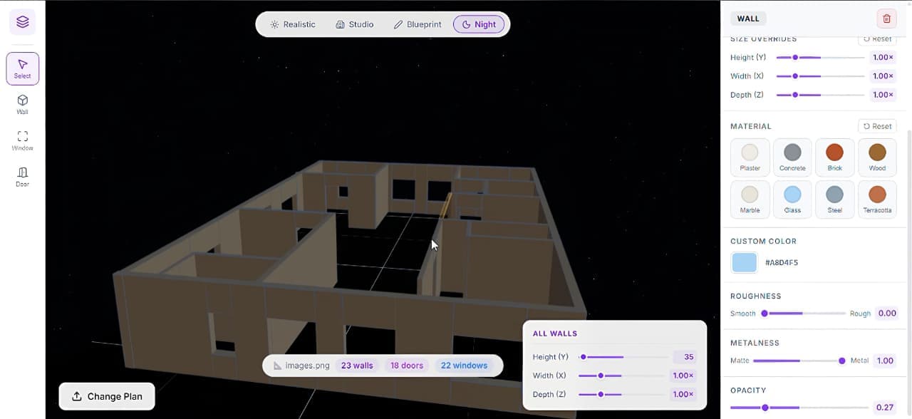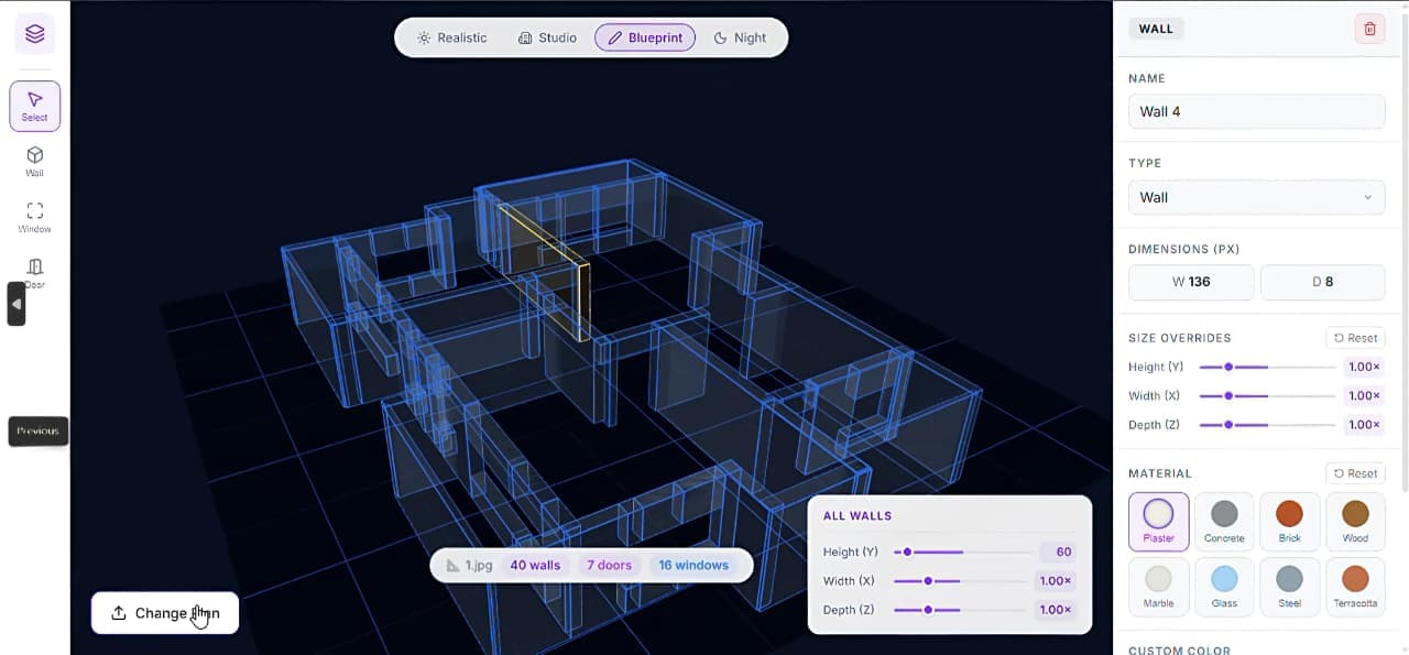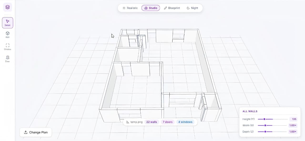 - Multi-room parsing with automatic door, window, and wall detection including curved walls and open-plan spaces