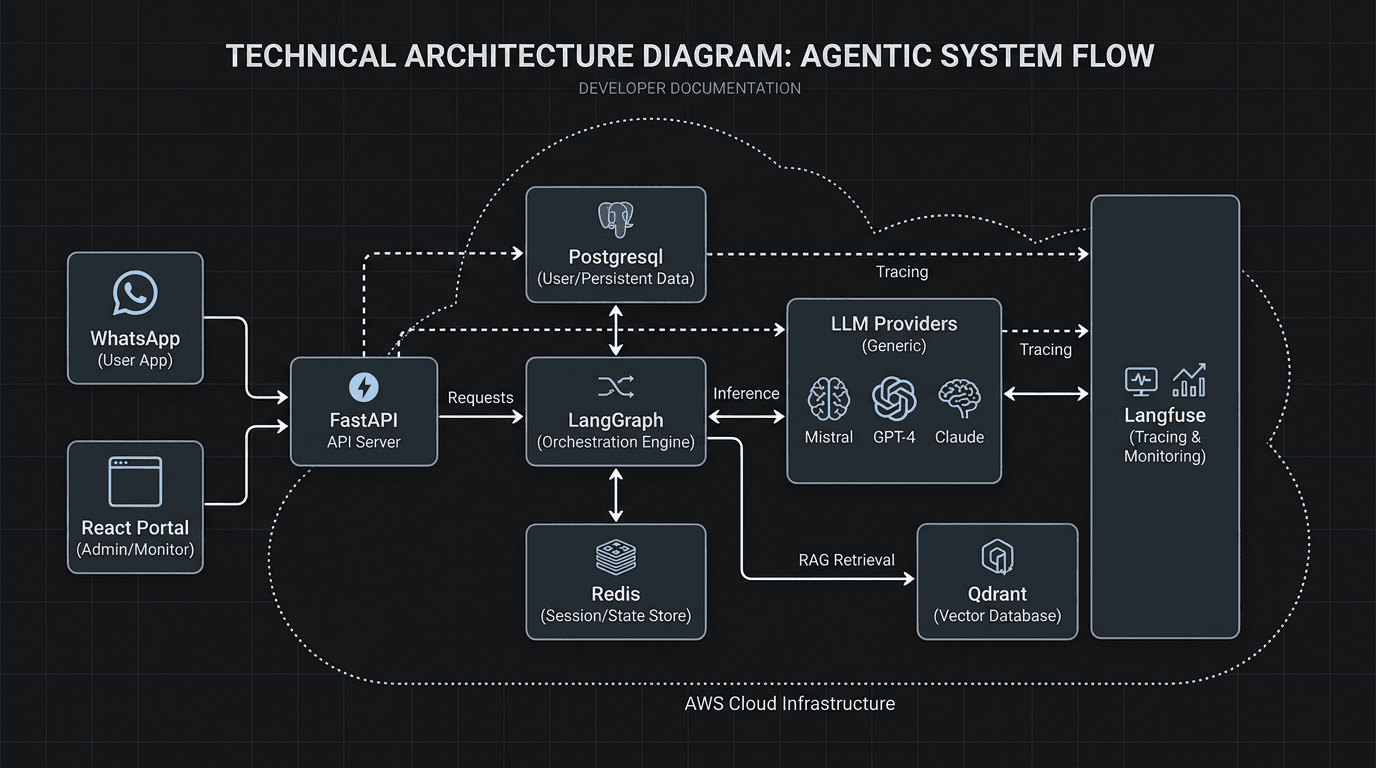- Flagship build demonstrating end-to-end conversational AI: WhatsApp channel, FastAPI services, LangGraph agents, durable memory, and a React analytics and boards portal